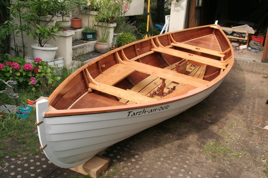 Elorn built by Philippe MacorReady for launching. The white colour outlines the clinker lines.First launching in Brest area (France)The sloop rig is well suited to this long hull.A narrow waterline for easy rowingExcellent widward ability