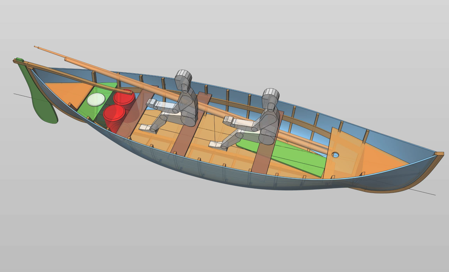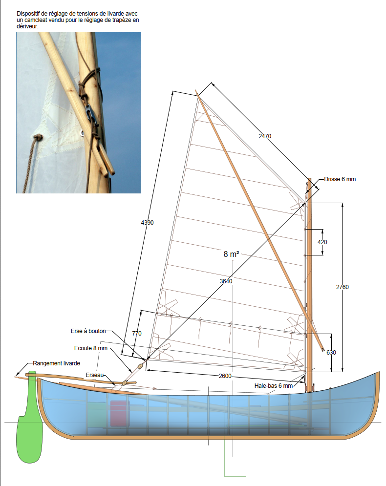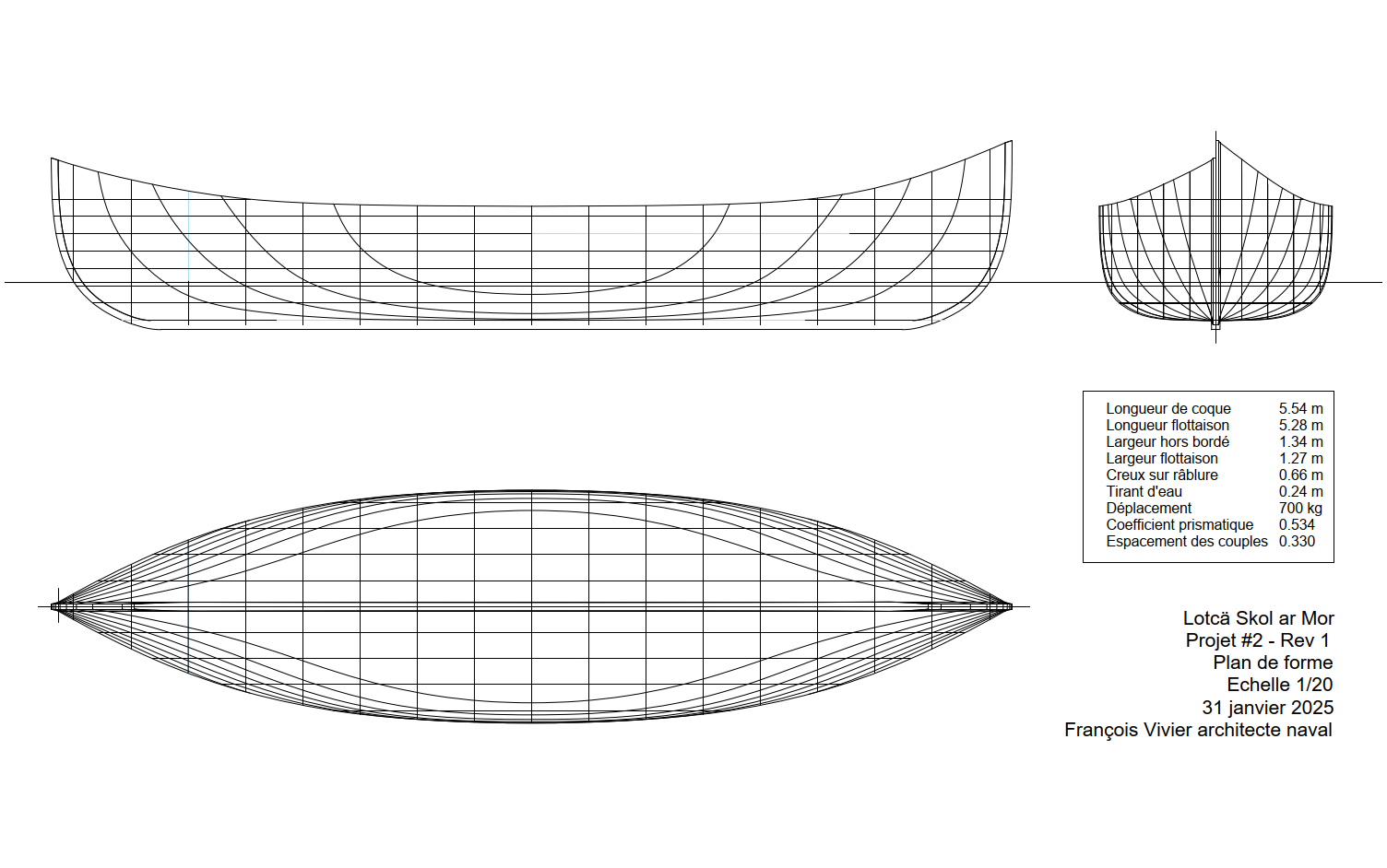Les dimensions de cette Lotca ont été définies en fonction du projet d’expédition : bon bateau d’aviron pour deux personnes, volume suffisant pour emporter le matériel nécessaire. Les formes sont symétriques, avant-arrière, mais plus relevées à l’avant. Les fonds sont très plats. On convient d’une voilure plus généreuse, avec un gouvernail et une dérive latérale de type de celles utilisées sur les batelleku, canots traditionnels basques. La construction se fait en bordé franc sur des membrures découpées. L’absence de puits de dérive permet de passer des nuits à bord quand il n’est pas possible de planter la tente à proximité. Un point important de mon rôle d’architecte naval a été de définir, en volume et en emplacement, des éléments de flottabilité permettant le redressement du bateau sans aide extérieure.