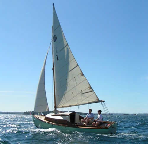 La petite quille, interrompue à l’arrière, permet une mise à l’eau aussi facile qu’un dériveur intégral, tout en protégeant le moteur hors-bord en puits qui est parfaitement à portée du barreur et placé dans l’axe du safran pour faciliter les manœuvres. Les puristes pourront enlever le moteur lors de la navigation sous voile en le plaçant, soit dans un coffre, soit simplement posé en travers à l’arrière. Ils pourront aussi utiliser une grande godille dont le rangement est prévu. Baille à mouillage à l’avant, équipets de rangement, hublot ouvrant en façade de rouf, etc.., rien n’est oublié pour le marin exigeant.