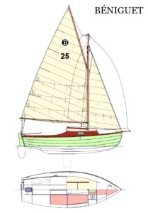 Béniguet est un petit bateau à cabine. Le programme est la sortie à la journée, tout en offrant un abri, la possibilité d’une sieste à l’ombre, un WC chimique ou marin, la possibilité de faire chauffer le thé ou préparer un repas chaud. Il est bien sûr possible de pratiquer la petite croisière côtière avec deux adultes et un ou deux enfant à l’avant, ou même avec 3 adultes avec une extension de la couchette avant. On a voulu privilégier l’espace extérieur, comme il convient à un bateau de cette taille. Le cockpit, avec ses bancs de 2 mètres de long, offre en effet un confort tout à fait exceptionnel et permettra de pêcher ou se promener sans gêne. Noter qu’il existe un espace abaissé de part et d’autre du puits moteur pour y poser un seau ou le matériel de pêche.